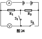 35. 如图24所示,电源电压为15V,R1=5Ω,R2=10Ω,求(1)当开关S1、S2均闭合时,电流表的读数是多少。(2)当S1闭合,S2断开时,电压表的读数是多少。