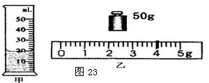 (3)将烧杯中一部分盐水倒入量筒中(如图23甲所示),量筒内盐水的体积是_______cm3。再称量烧杯和剩下的盐水总质量时,发现加减砝码总不能使天平平衡,这时应移动 使天平平衡;