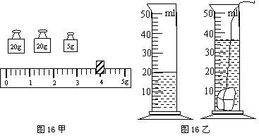 玄武岩是修理公路、铁路、机场跑道所用石料中比较好的材料,具有抗压性强、抗腐蚀性强等优点,使用天平和量筒测玄武岩的密度。用调好的天平测量玄武岩的质量,天平平衡时,右盘中的砝码及游码在标尺上的位置如图16甲所示,玄武岩的质量是________g;测量玄武岩体积如图16乙所示,玄武岩的体积是______cm3;计算得到玄武岩的密度是________________kg/m3。