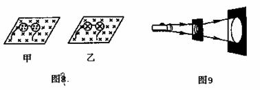22.图8是小明用两副眼镜所做的实验情况,其中眼镜___是同学们戴的近视眼镜(填“甲”或“乙”),它对光起____作用.图9是小红的实验情况,她在一厚纸板的中间挖一个洞,放上透镜,让手电筒正对着透镜照射,在墙上观察到的光斑,由此可知该透镜是___透镜.它与左图8中的_____眼镜是相同的.