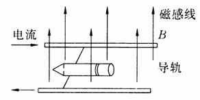例10 电磁炮是利用电磁发射技术制成的一种先进的武器,具有速度快、命中率高等优点。它的主要原理如图所示,通电导体在磁场力的作用下沿导轨加速运动,系在通电导体上的弹体以10km/s的速度发射出去,电磁炮的发射过程是________能向__________能转化过程。