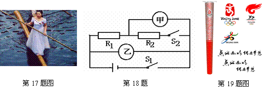 17.“独竹漂”是指运动员脚踏漂流在水面上的单棵楠竹(如图),依靠小竹竿划动达到水上漂行的一项民族传统体育项目。选手表演时赤着脚,手执一根细竹竿做“桨”,表演“乘风破浪”、倒退、转身、绕弯、换竿等绝技,颇有“一苇渡江”之妙。若楠竹的质量为10kg,运动员和细竹竿共重500N,则此根楠竹所产生的浮力为 N(g取10N/kg), 此时排开水的体积为 m3。