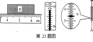 根据上图情况填写实验结果:(1)木块的长度是 cm (2)温度计的读数是 ℃(3)弹簧测力计的读数是 N.