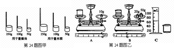 24.小明去某古镇旅游时发现,米酒是当地的一种特产。小店卖米酒和卖酱油都用竹筒状的容器来量取,但量取相同质量的米酒时所用的器具比量取酱油的要大一点,如图甲所示。