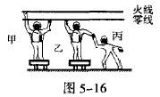 1.如 5-16所示,甲、乙两人都站在干燥的木凳上,丙站在地上并与乙手拉手。上下两条裸露导线分别是照明电路的火线和零线,那么一定会触电的是( )。