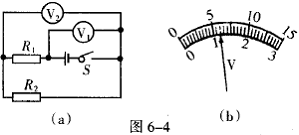 6.(江西省)在如图6-4(a)所示电路中,当闭合开关后,两个电压表指针偏转均为图6- 4(b)所示,则电阻R1和R2两端的电压分别为( )。