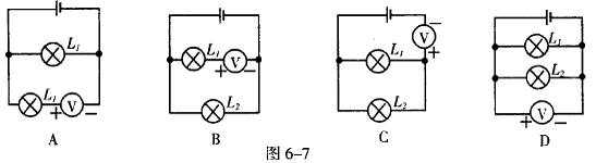 9.小凡在做用电压表测电压的实验中,他刚一闭合开关S,就听到啪的一声异响,他赶忙断开S,再观察电压表时,指针已弯曲,试分析小凡在实验中可能是由于哪些原因而导致这种后果的发生?依据你的经验,判断如图6-7测量灯泡L1两端的电压的四个电路中,正确的是( ) 。