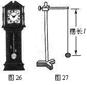 32.(09福州市)小明注意家里摆钟(图26)的钟摆在有规律地摆动,经认真观察发现钟摆来回摆动一次的时间刚好是1秒,就想:是不是所有的摆来回摆动一次的时间都是1秒呢?于是,他请教了物理老师,知道摆来回摆动一次的时间叫做周期,在老师的指导下他设计如图27所示的单摆(即细绳下系一小钢球)进行探究。实验数据记录如下表: