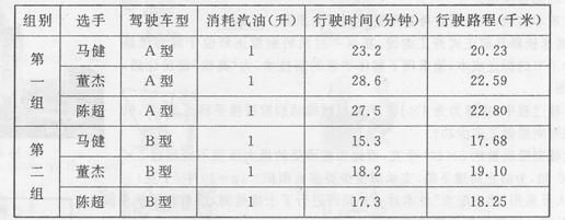 32.(09嘉兴)某汽车公司组织了一次新车型节油大赛,比赛分两组:第一组使用A型车(排量1.6升)。第二组使用B型车(排量2.0升)。A、B型车外观和体积相同,属于同一产品系列。