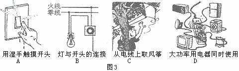 用电安全是保证人民生命财产安全的基本常识。图3所示的四幅图中符合安全用电的是: