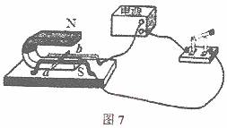 图7为研究磁场对通电导线作用的实验装置,当接通电源,有电流由a至b通过导线ab时,它将受到磁场力作用而向左运动,则:A、当磁场方向相反时,ab将向右运动,电能转化为机械能 B、当电流方向相反时,ab将向右运动,机械能转化为电能 C、当电流和磁场方向同时改变时,ab将向右运动,电能转化为机械能 D、当电流和磁场方向同时改变时,ab将向左运动,机械能转化为电能