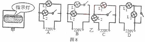 如图8甲图所示,家庭照明灯的一种按键开头上有一个指示灯,在实际使用中发现,当开关闭合时,只有照明灯发光;开关断开时,照明灯熄灭,指示灯会发出微弱的光,以便夜间显示开关的位置。据此开关的控制特性,能正确表示照明灯(L1)和指示灯(L2)连接方式的电路图是乙图中的: