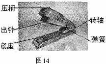 如图14所示,是我们常见的订书机,订书机在构造上应用了许多我们的物理知识,请你根据示例找出两处:示例:弹簧的弹性势能转化为动能使订书机及时复位。