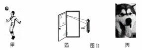21.根据如图11所示的三个物理小实验或现象回答相关的问题。甲图表示足球运动员用头顶球,球的方向就改变了;乙图表示一个弹簧门在推开以后能自己关闭;丙图表示天热时,狗靠伸长舌头散热。