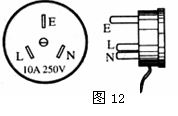 (1)如图12所示,他发现自己家洗衣机用的是三脚插头,其铭牌上标有“10A 250V”字样,其