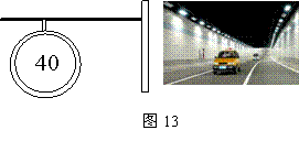 2009年1月1日9时整,江西首条湖底隧道开通.这条隧道西起阳明东路京九线隧道,东至国威路和上海北路交叉口,全长1965m,双向6车道,其中湖底暗埋段550m.在湖底隧道口有一交通标志牌如图13所示,交通标志牌上数字的含义是什么?在遵守交通规则的前提下, 一辆小车通过湖底暗埋段至少需要多少时间?