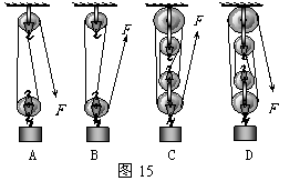 (2)小明同学看到火炬手攀爬很费劲,想到物理课上学过利用滑轮组可以省力.小明同学如果站在地面上,用如图15所示的哪个滑轮组拉起火炬手侯斌最合适,理由是什么?如果该滑轮组机械效率为80%,求小明同学的拉力至少要多大?(g取10N/kg)