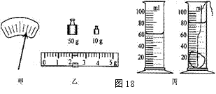 ⑶用调节好的天平称小矿石的质量.天平平衡时,放在右盘中的砝码和游码的位置如图18乙所示;量筒量出小矿石的体积如图18丙所示,由此可知,小矿石的密度ρ=