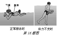 16.有一种被称作“跟屁虫”的辅助装备是游泳安全的保护神。“跟屁虫”由一个气囊和腰带组成,两者之间由一根线连接。正常游泳时,连接线是松驰的,气囊漂浮着,跟人如影相随。在体力不支等情况下,可将气囊压入水中,防止人下沉,在此情况下