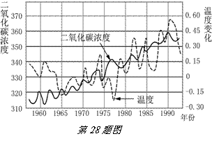 28.(1)有观点认为:大气中的二氧化碳浓度增加会提高大气温度,导致温室效应。如图是科学家对1955-1995年期间地球大气的一个观测结果,你认为这个结果是否支持上述观点?请先判断,再写出判断依据 ▲ 。