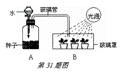 下图中A与B两装置分别表示种子和幼苗进行的生理作用,A、B装置间用玻璃管连接。请据图回答: