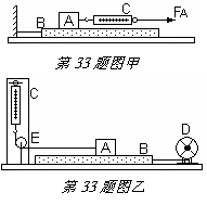 33. 如图甲所示,A是木块,B是长木板,C是弹簧测力计,另有砝码、棉布、毛巾等物。若匀速拉动弹簧测力计,可测出木块受到的摩擦力。