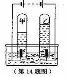 14同学们为了探究水的组成,用如图所示的装置进行实验。通电后两电极都有气体放出,经检验甲试管里的气体能燃烧,乙试管里的气体能使带火星的木条复燃。若氢原子模型用“ ”表示氧原子模型,用“ ”表示,则构成甲试管中气体微粒的模型可表示为