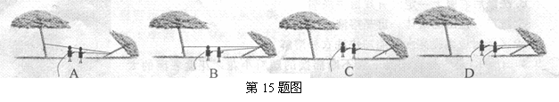 15.台风是一种破坏力很大的灾害性天气。某次台风把市民公园的一棵大树吹倒了,需要两个工人把它扶起,工人们想到了下列图示四种方案,每个人所需拉力最小的方案是