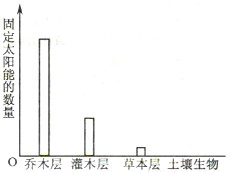 (1)图中显示乔木层固定的太阳能 ▲ (填“等于”或“大于”或“小于”)灌术层和草本层固定的太阳能,导致这一结果的主要非生物因素是 。