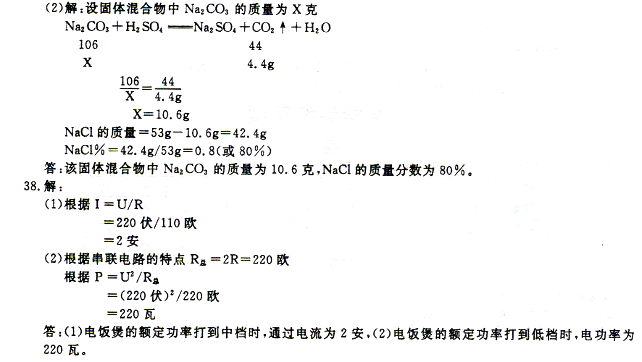 (2)已知:Na2CO3+H 2SO4一Na2SO4+H2O+CO2↑,现有精盐(NaCl)和纯碱 (Na2CO3)两种固体混合物53克,加入足量的稀硫酸,充分反应后,生成4. 4克二氧化碳气体,则该固体混台物中纯碱(Na2CO3)的质量是多少克?该固体混合物中氯化钠的质量分数是多少?