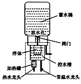 36.图甲是一种常见的台式饮水机结构示意图。控水槽内的塑料浮体是一个体积为90cm3的空心圆柱体,其质量和厚度可忽略不计。浮体通过一轻质硬杆与阀门相连。当浮体浸没时,阀门恰好将面积为2cm2的放水孔关闭。此时蓄水桶中水位最高。