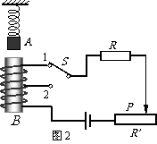 6.如图2所示,A是悬挂在弹簧下的铁块,B是螺线管的铁芯,S是转换开关(S接1时连入电路的线圈匝数多,S接2时连入电路的线圈匝数少),P是滑动变阻器的滑片。要使弹簧的长度变长,可采取的办法是