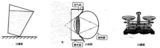 33、(3分)人在水中看物体会成像在视网膜后,相当于人眼的晶状体变 _________(选埴“厚”、“薄”)。潜水员戴上潜水镜实质是在眼前加上一个空气层,如图。请根据图中已有的光路,完成光路图,画出物体A的大致位置。