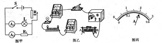 (3)闭合开关前,滑动变阻器的滑片要置于 ________端(选填“A”、“B”)。调节变阻器,灯泡正常发光时电流表A1的示数如图丙,则小灯泡的额定功率是 __________W。