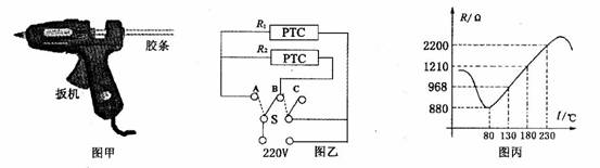 38、(7分)热熔胶在室温下为固体,加热到一定程度时变为较强粘性的液体,冷却后,将物体牢牢地粘在-起。如图甲是热熔胶枪的外形,其内部有2只相同的PTC加热元件,电路如图乙。单只PTC元件的电阻与温度的变化如图丙所示。扣动扳机能使固体胶条向前挤压,联动开关S同时倒向A、B,枪门冒出胶液,松开扳机S同时倒向B、C。