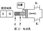 (1)心肺机的功能之一是用“电动泵”替代心脏,推动血液循环。如图15所示,将线圈ab缠绕并固定在活塞一端,利用与固定磁铁之间的相对运动,带动电动泵中的活塞,抽送血液。图中阀门K1只能向外自由开启,反向则封闭管路; 阀门K2只能向内自由开启,反向则封闭管路。