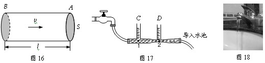 (1)如图16所示,水流在粗细均匀的水平管道内向右匀速流动,设水流速度为v,管内通道的横截面积为S。取一段管道AB,水从B端流到A端所用时间为t,则AB间水柱的长度l = ,体积V = (要求用S、v、t表示)。根据流量的定义 Q = V/t 可得