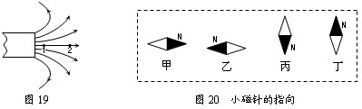 (1)图19为某磁极附近磁感线的方向和分布的示意图。由图可知,该磁极为 极,若在1处放置一个小磁针,当小磁针静止时,其指向应是图20中的 。
