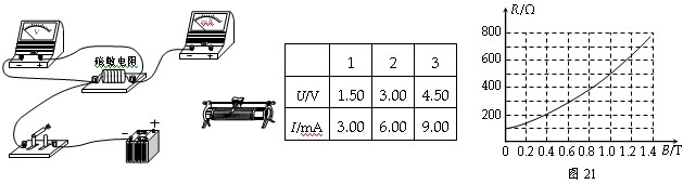 (2)如果电阻的大小随磁场的强弱变化而变化,则这种电阻叫磁敏电阻。某磁敏电阻R的阻值随磁感应强度B变化的图象如图21所示。根据图线可知,磁敏电阻的阻值随磁感应强度B的增大而 。图线没有过坐标原点,是因为 。