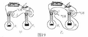 32.(9分)为了探究电流产生的热量跟什么因素有关系,王军设计了如图19所示的甲、乙两装置。他将两段阻值不同的电阻丝(R1<R2)分别密封在两个完全相同的烧杯中,并通过短玻璃管与相同的气球相连,两次实验电源电压不变。