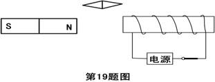 19.(3分)如图所示,是开关闭合后,小磁针在条形磁体和通电螺线管的共同作用下,在图中位置处于静止状态,请你根据条形磁铁的极性标出小磁针和通电螺线管的南、北极以及电源的正、负极。