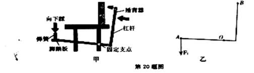20.(3分)如图甲所示是小宇同学发明的捶背椅,当坐在椅子上的人向下踩脚踏板时,捶背器便敲打背部进行按摩。请你在图乙中画出踩下脚踏板敲打背部时,杠杆B点受到的阻力F2、阻力臂L2及动力臂L1。