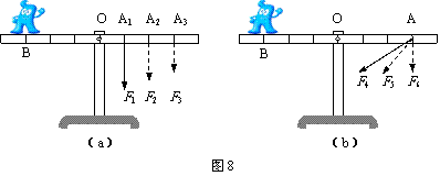(3)进一步分析图8(b)所示的实验现象及表二中的实验数据,可以发现,作用在杠杆一端的阻力不变时,要使杠杆平衡,当动力作用点不变,动力的方向改变以后,动力的大小与______________________________有关,____________________________________。