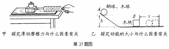 27.(1)当要研究的物理量不易直接测量时,都需要想办法把它们的大小间接显示出来.例如:甲实验是让木块在木板上做________________运动,通过弹簧测力计的示数间接显示滑动摩擦力的大小;乙实验中动能的大小是通过________________间接反映出来的.