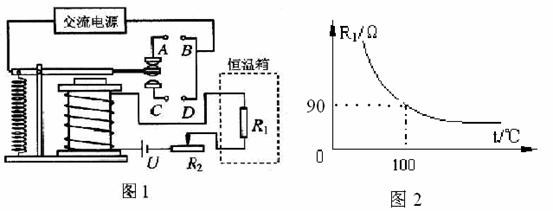 32、小明利用实验室的电磁继电器、热敏电阻R1、可变电阻器R2等器件设计了一个恒温箱控制电路,如图1所示。其中“交流电源”是恒温箱加热器的电源(加热器在恒温箱内,图中未画出);R1处于恒温箱内,图2是小明通过实验测得的R1的阻值随温度变化的关系曲线;电磁继电器的电源两端电压U = 6 V,电磁继电器线圈的电阻可不计,通过实验测得当电流为40mA时,电磁继电器的衔铁被吸合、恒温箱内的加热器停止加热,此时可变电阻R2=0Ω,恒温箱可保持60℃恒温。