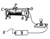 20、如右图所示的电路中,如果滑动变阻器的滑片P由A向B滑动时,灯泡变暗,导线的E端应接在滑动变阻器的____A____接线柱上(选填“C”、“A”或“B”)。