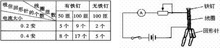 3. 小明用自制的电磁铁来研究它的磁性强弱与哪些因素有关。实验器材:两个相同大小的大铁 钉、一些漆包线、开关、电源、滑动变阻器、一些回形针和电流表等。在实验中,用漆包线绕制横截面和紧密程度相同的三个线圈,其中两个线圈插入铁钉,另一个线圈内无铁钉。按如图电路进行实验,实验记录的数据如下表: