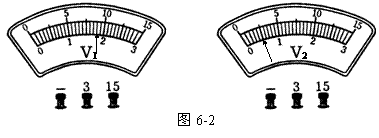 3.如图6-2所示,两只电压表所用的量程不明,但已知电压表V1的示数比电压表V2的示数要小一些,则V1所用的量程是 V,其示数为 V; V2所用的量程是 V,其示数为 V .