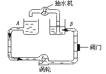 水泵(保持一定的水压) 水管(传输水流) 涡轮(利用水能工作的设备) 阀门(控制水流的通断) |