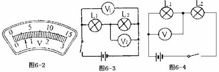 5.如图6-3,当开关闭合后,两灯都发光,此时V1、V2表的读数分别是4v和2.5v,则电源电压为___v ,灯L1 两端的电压为___V ,灯L2 两端的电压为___V。